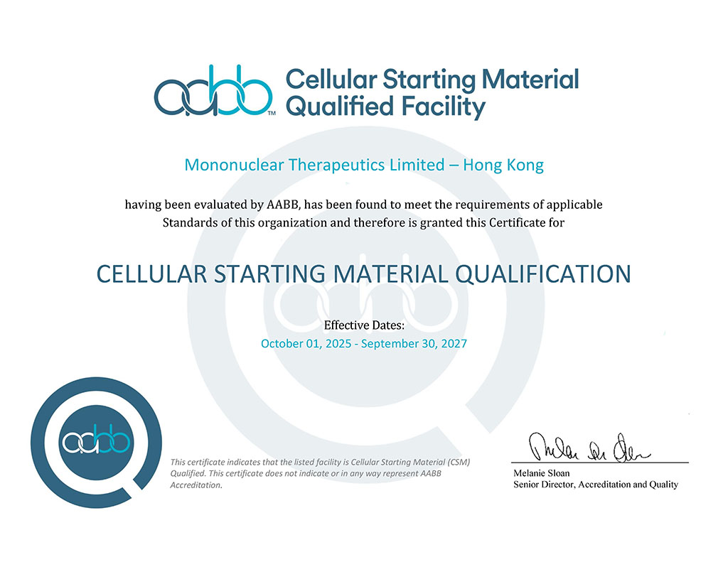 The MonoTx™ cord blood cell bank is an AABB accredited, and FDA registered public bank. The cord blood units are collected at the largest childbirth center in Hong Kong, the Prince-of-Wales Hospital. Donated umbilical cord blood is collected following the newborns birth and is delivered to the MonoTx™ laboratory under controlled conditions. Cord blood processing is carried out in the cleanroom to isolate the hematopoietic stem cells (mononuclear cell-enriched). Cord blood mononuclear cells are tested to ensure all banking criteria are met, including cell number, viability, potency, and negativity for microbial growth. Human leukocyte antigen (HLA) typing is performed on the cord blood cells, a requirement for the selection of units appropriate for transplantation.